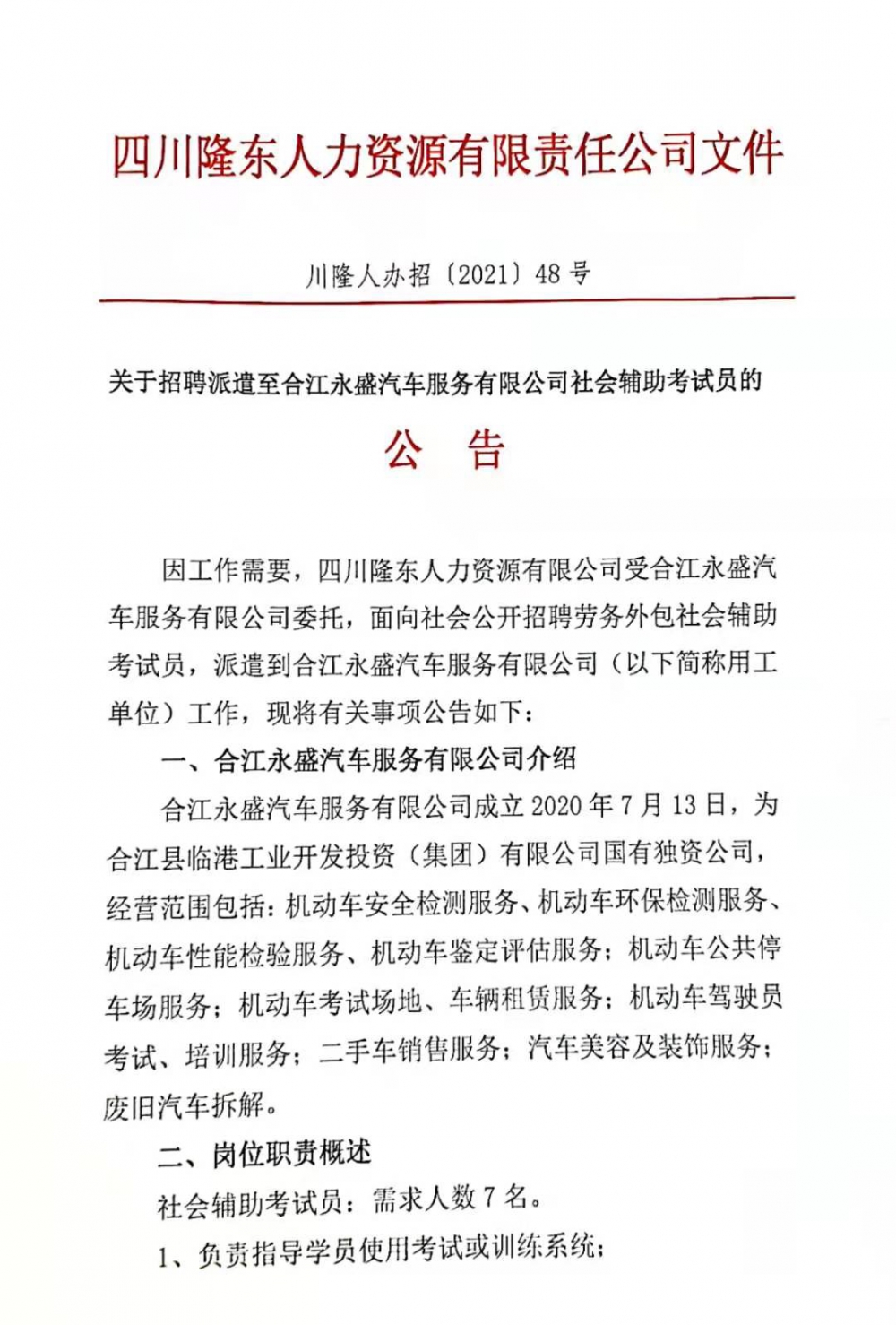 關(guān)于招聘派遣至合江永盛汽車(chē)服務(wù)有限公司社會(huì)輔助考試員的公告