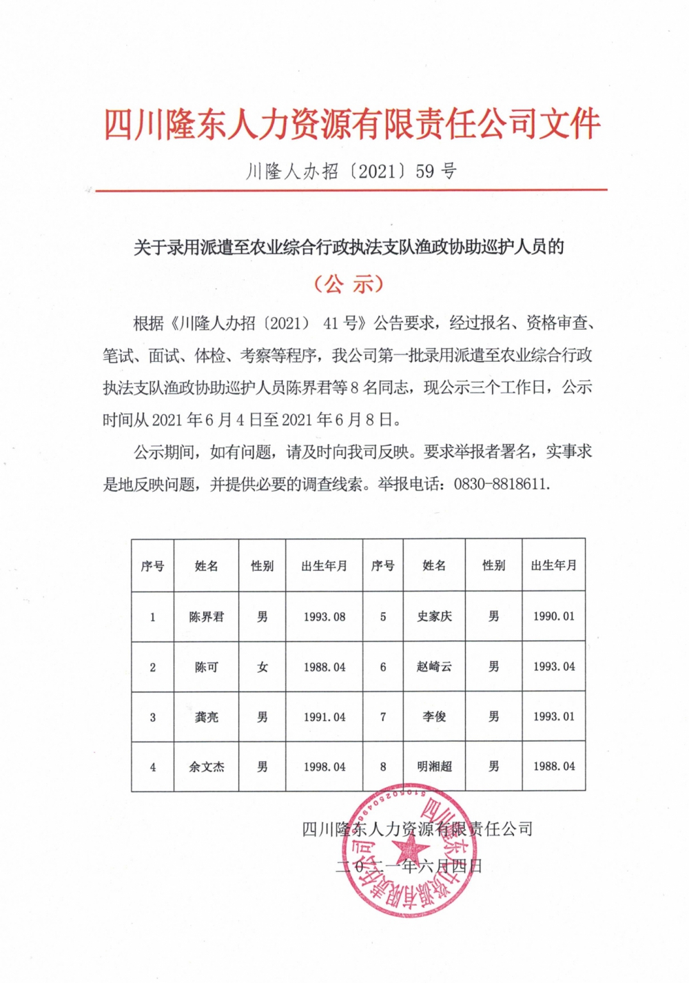關(guān)于錄用派遣至農(nóng)業(yè)綜合行政執(zhí)法支隊漁政協(xié)助巡護(hù)人員的(公 示)