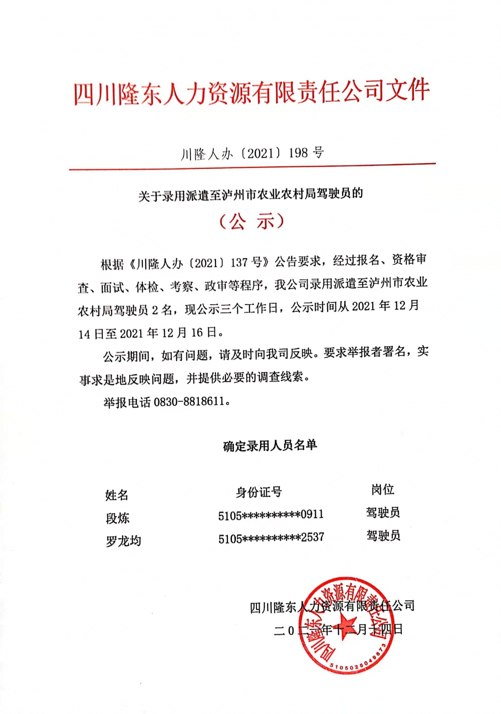 關(guān)于錄用派遣至瀘州市農(nóng)業(yè)農(nóng)村局駕駛員的 (公 示)