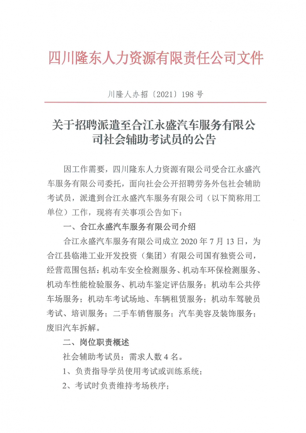 關于招聘派遣至合江永盛汽車服務有限公司社會輔助考試員的公告