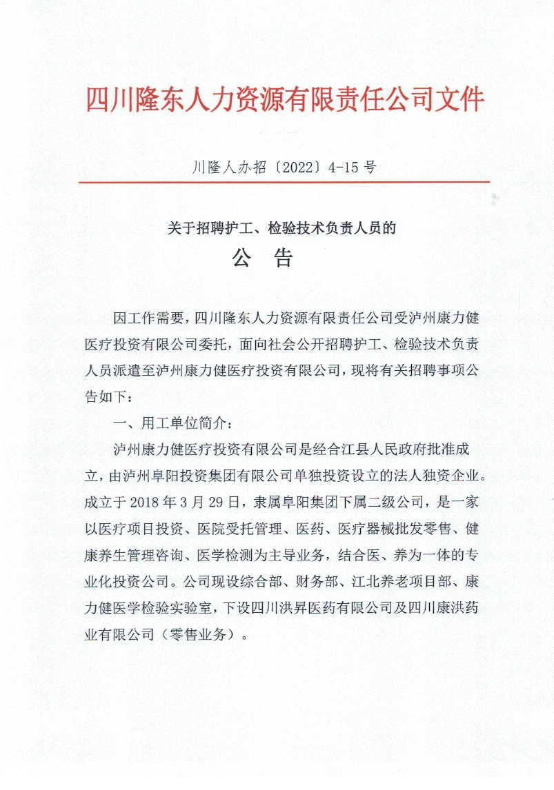 關(guān)于招聘護工、檢驗技術(shù)負責人員的公告