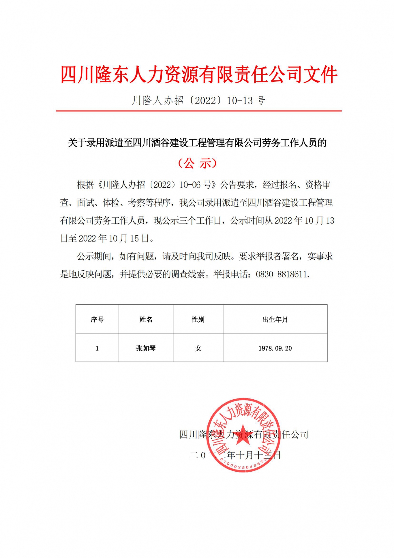 關(guān)于錄用派遣至四川酒谷建設(shè)工程管理有限公司勞務(wù)工作人員的 (公 示)