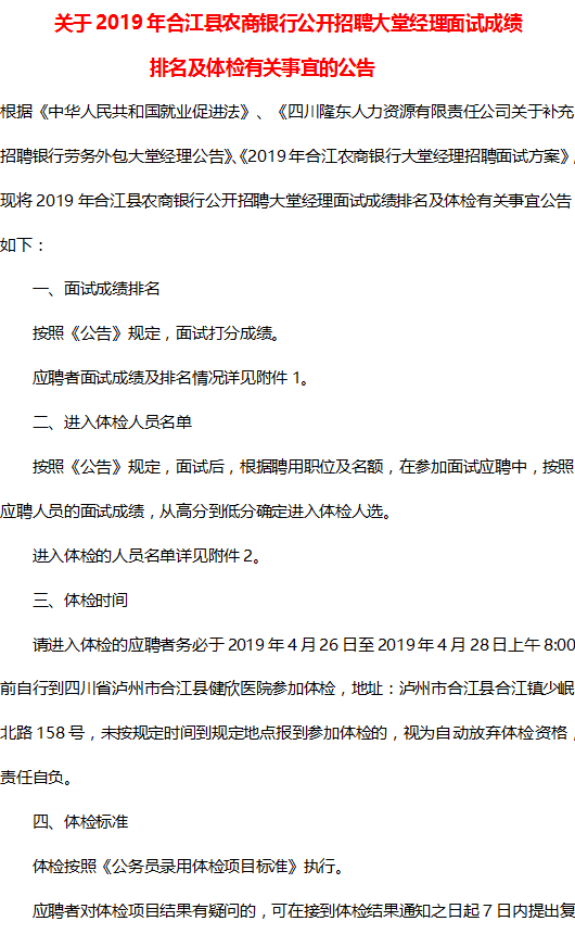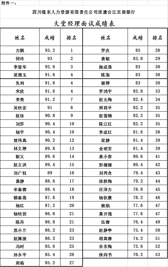 四川隆東人力資源有限責(zé)任公司派遣合江縣農(nóng)商銀行大堂經(jīng)理面試成績表排名及體檢有關(guān)事宜的公告