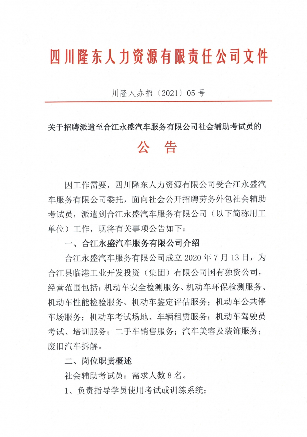 關于招聘派遣至合江永盛汽車服務有限公司社會輔助考試員的 (公 告)