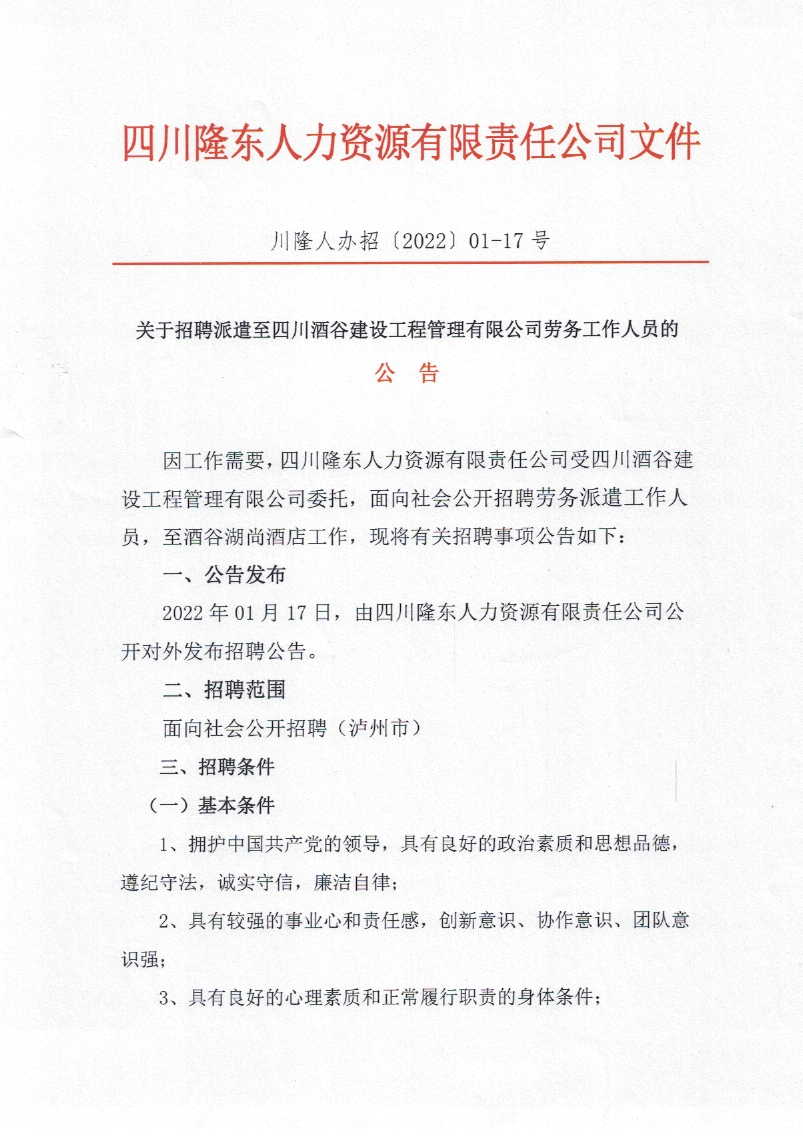 關(guān)于招聘派遣至瀘州市市政公用事業(yè)服務(wù)中心維護(hù)工作人員的公 告因工作需要,我司受瀘州市市政公用事業(yè)服務(wù)中心委托面向社會(huì)公開招聘勞務(wù)派遣工作人員,派遣到瀘州市市政公用事業(yè)服務(wù)中心工作,具體事項(xiàng)如下:一、招聘程序發(fā)布公告 2021年10月10日,由四川隆東人力資源有限責(zé)任公司公開發(fā)布招聘公告。二、招聘名額...