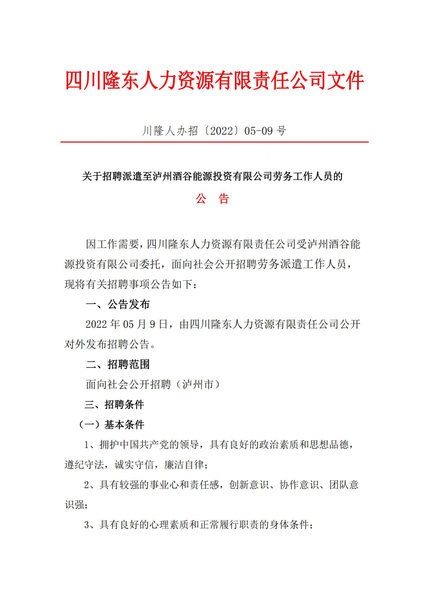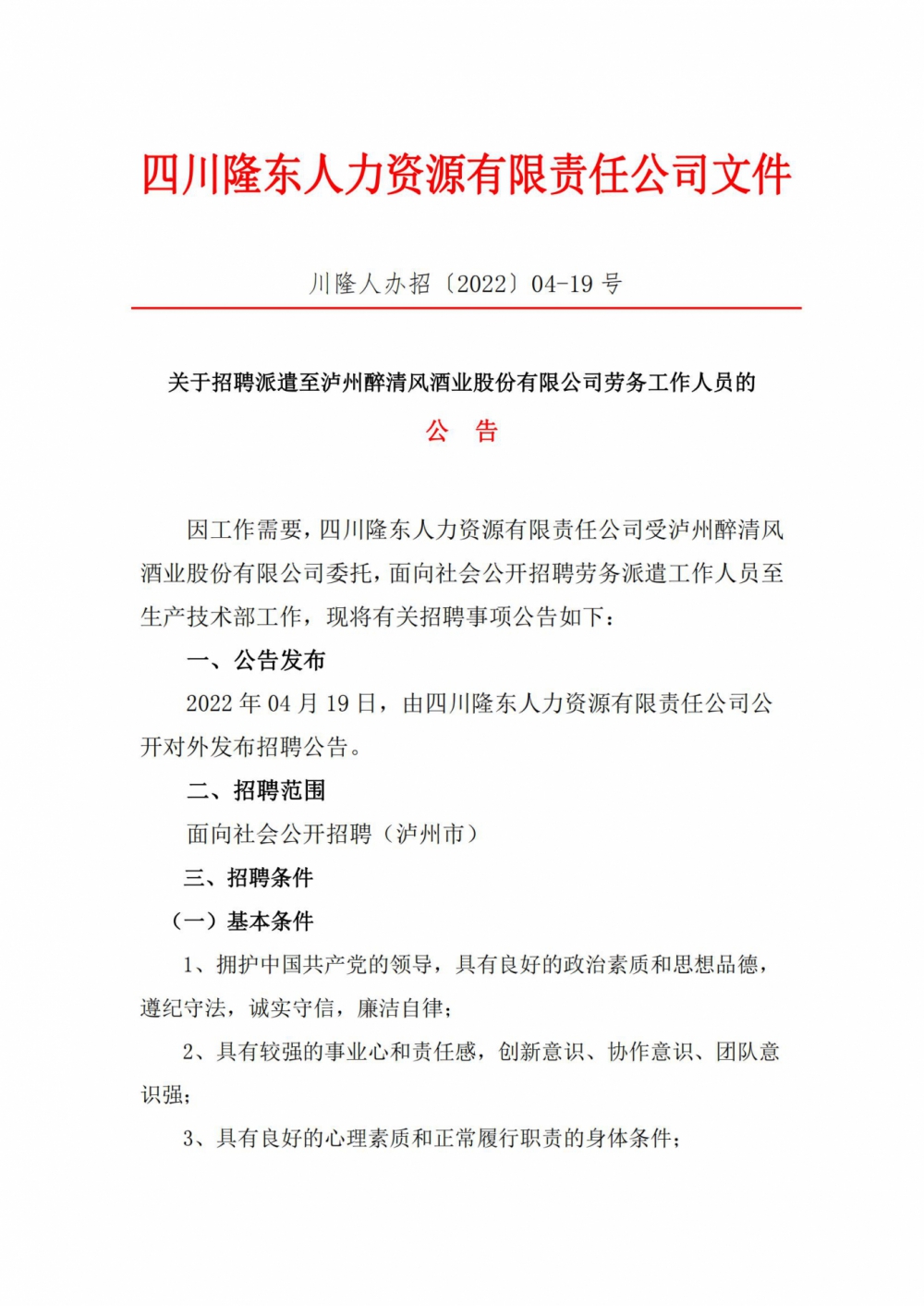 因工作需要,四川隆東人力資源有限責(zé)任公司受瀘州醉清風(fēng) 酒業(yè)股份有限公司委托,面向社會公開招聘勞務(wù)派遣工作人員至 生產(chǎn)技術(shù)部工作,現(xiàn)將有關(guān)招聘事項公告如下