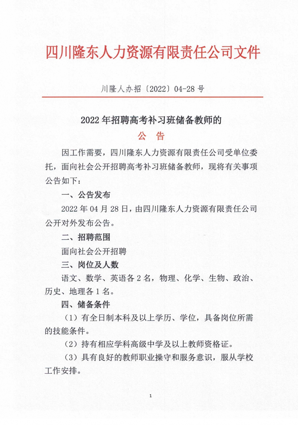 因工作需要,四川隆東人力資源有限責(zé)任公司受單位委托,面向社會公開招聘(儲備)高考補(bǔ)習(xí)班教師,現(xiàn)將有關(guān)招聘事項公告如下