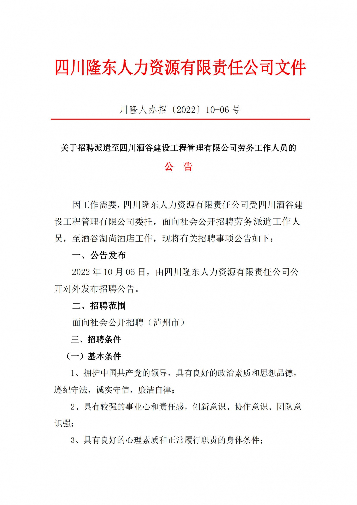 根據(jù)《川隆人辦招〔2022)10-06 號(hào)》公告要求,經(jīng)過報(bào)名、資格審查、面試、體檢、考察等程序,我公司錄用派遣至四川酒谷建設(shè)工程管理有限公司勞務(wù)工作人員,現(xiàn)公示三個(gè)工作日,公示時(shí)間從2022 年10 月13日至2022 年10 月15 日。