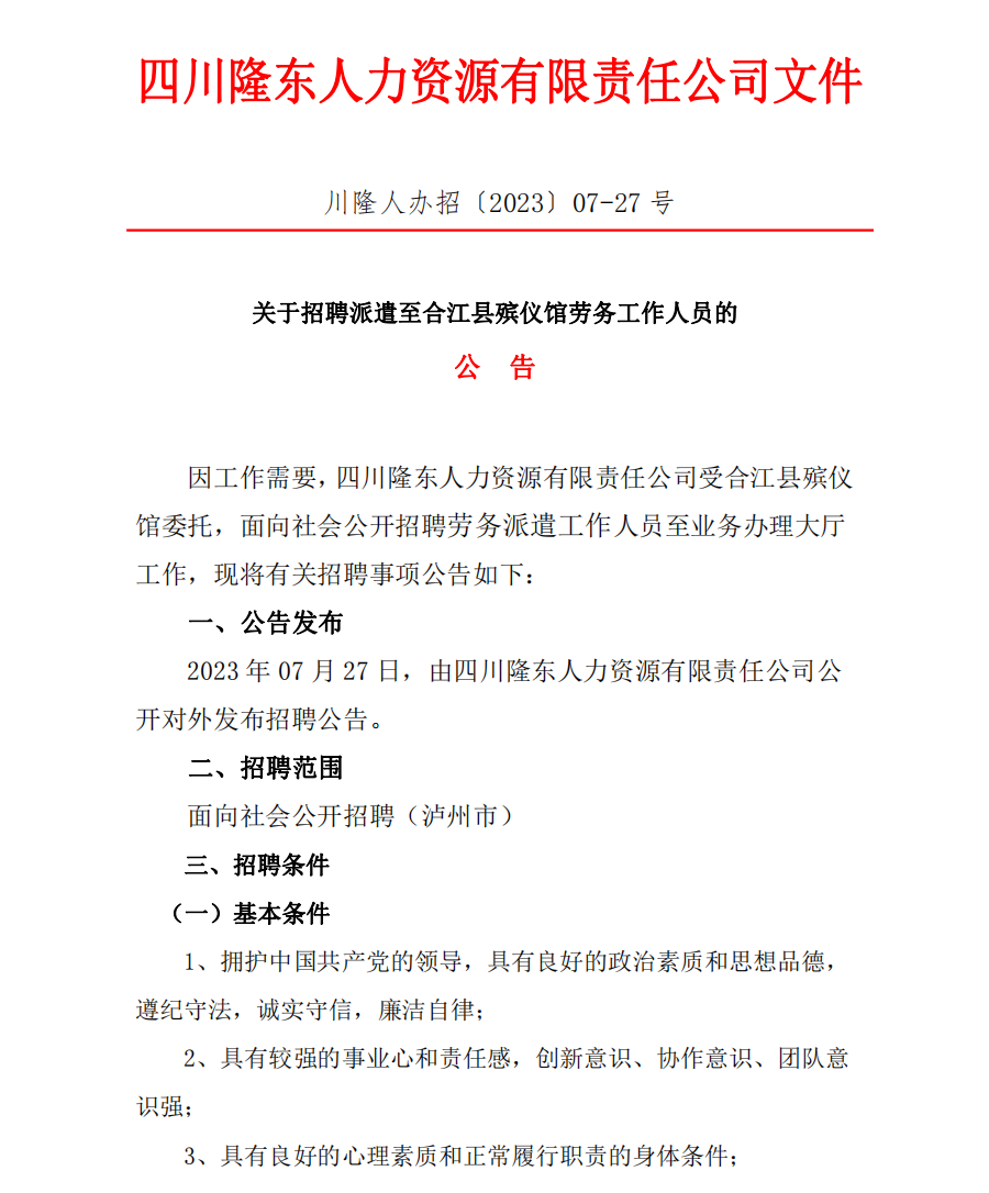 四川隆東人力資源有限責(zé)任公司文件 川隆人辦招〔2023〕09-24號(hào)關(guān)于招聘派遣至瀘州白酒產(chǎn)業(yè)園區(qū)綜合服務(wù)中心勞務(wù)工作人員的 公 告 因工作需要,四川隆東人力資源有限責(zé)任公司受瀘州白酒產(chǎn)業(yè)園區(qū)綜合服務(wù)中心委托,面向社會(huì)公開(kāi)招聘勞務(wù)派遣工作人員,至瀘州白酒產(chǎn)業(yè)園區(qū)綜合服務(wù)中心工作,現(xiàn)將有關(guān)招聘事項(xiàng)公...