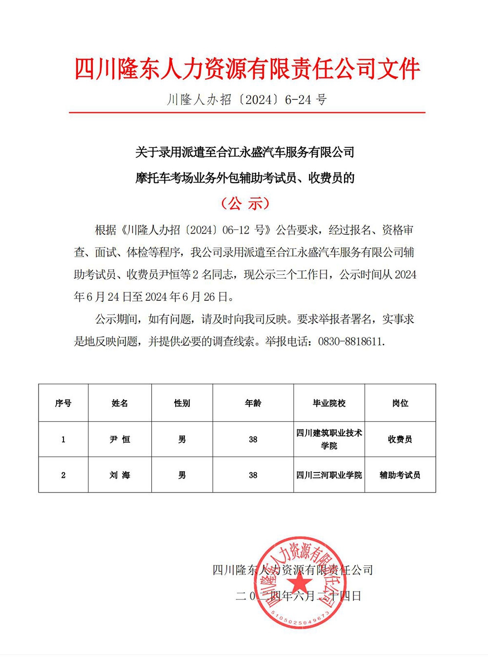 根據(jù)《川隆人辦招〔2024〕06-12 號(hào)》公告要求,經(jīng)過(guò)報(bào)名、資格審查、面試、體檢等程序,我公司錄用派遣至合江永盛汽車(chē)服務(wù)有限公司輔助考試員、收費(fèi)員尹恒等2 名同志,現(xiàn)公示三個(gè)工作日,公示時(shí)間從2024年6 月24 日至2024 年6 月26 日。公示期間,如有問(wèn)題,請(qǐng)及時(shí)向我司反映。要求舉報(bào)者署...