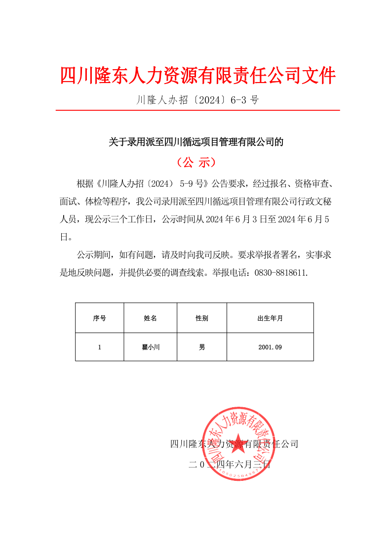 根據(jù)《川隆人辦招〔2024) 5-9號(hào)》公告要求,經(jīng)過(guò)報(bào)名、資格審查、面試、體檢等程序,我公司錄用派至四川循遠(yuǎn)項(xiàng)目管理有限公司行政文秘人員,現(xiàn)公示三個(gè)工作日,公示時(shí)間從2024年6月3日至2024年6月5日。